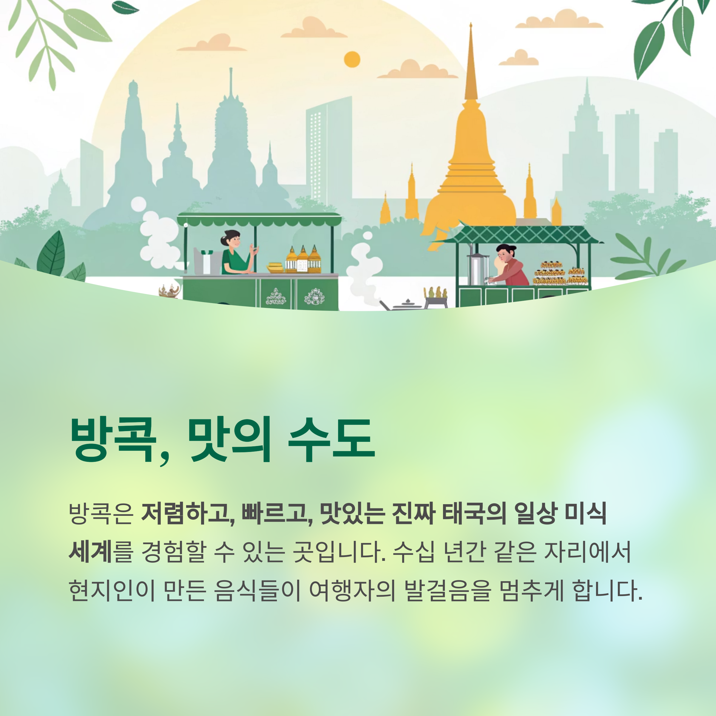 방콕은 단순한 관광지를 넘어 **‘맛의 수도’**라 불릴 만큼 다양한 길거리 음식을 자랑합니다.