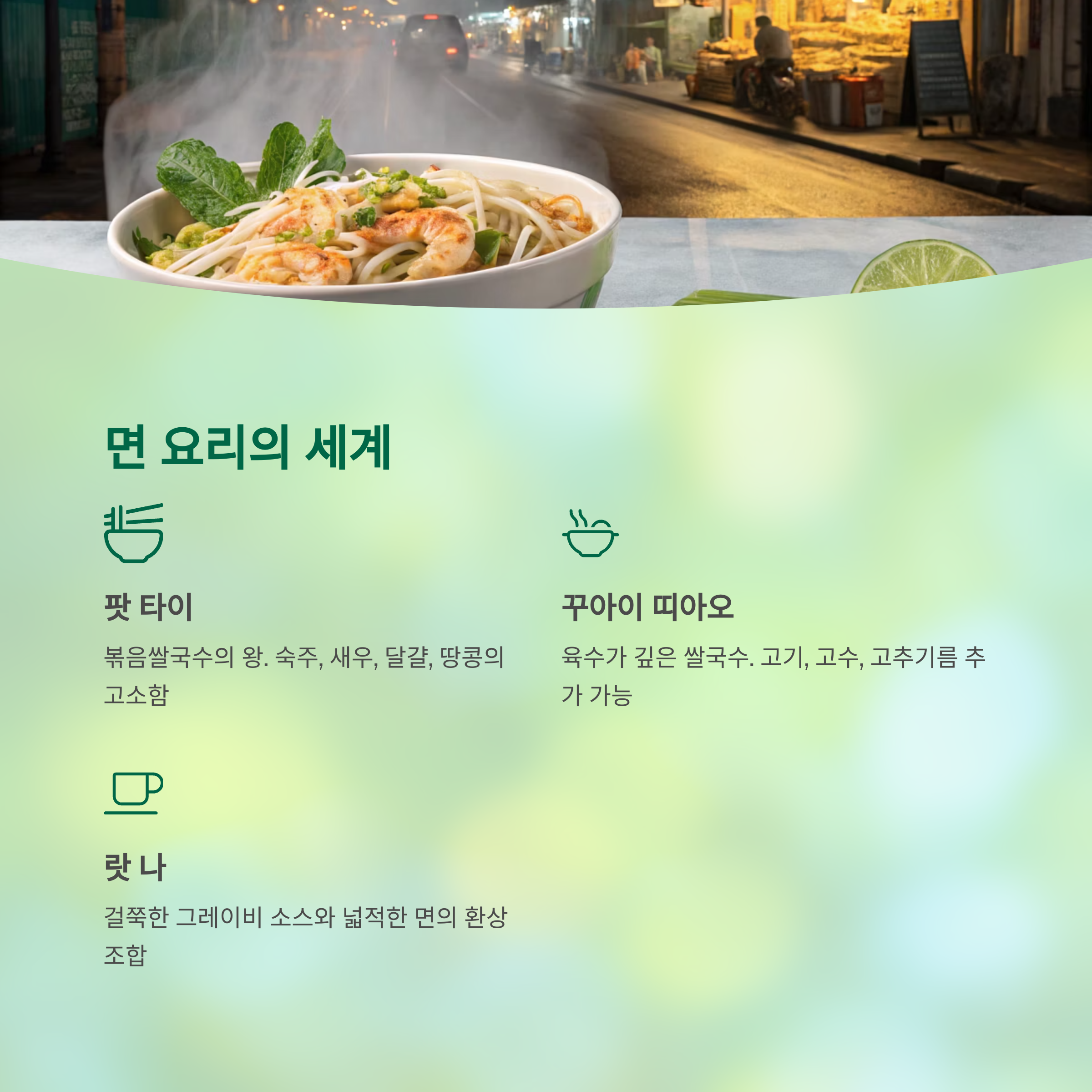 - 팟 타이: 볶음쌀국수의 왕. 숙주, 새우, 달걀, 땅콩의 고소함이 살아있습니다