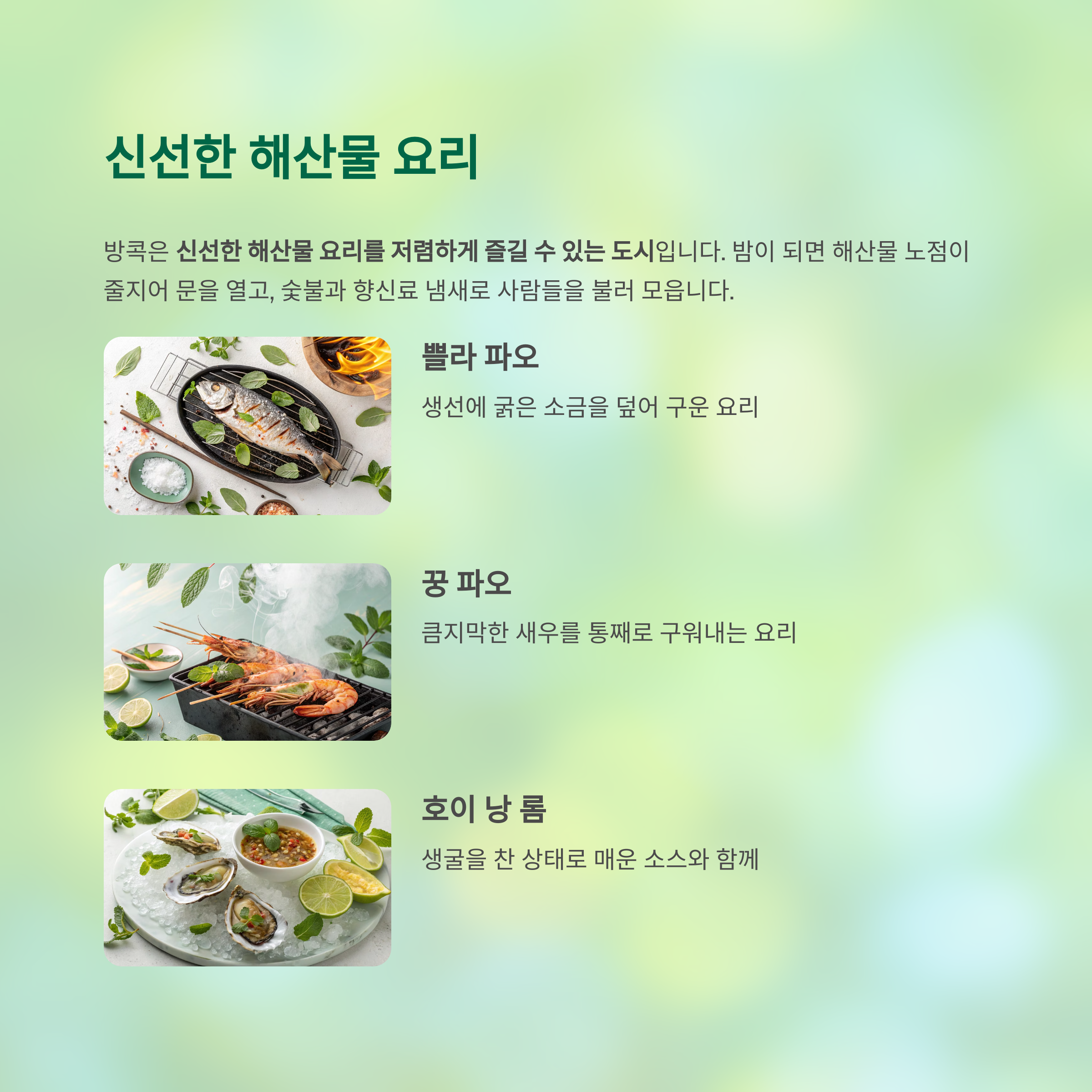 방콕은 항구도시만큼 신선한 해산물 요리를 저렴하게 즐길 수 있는 도시입니다.