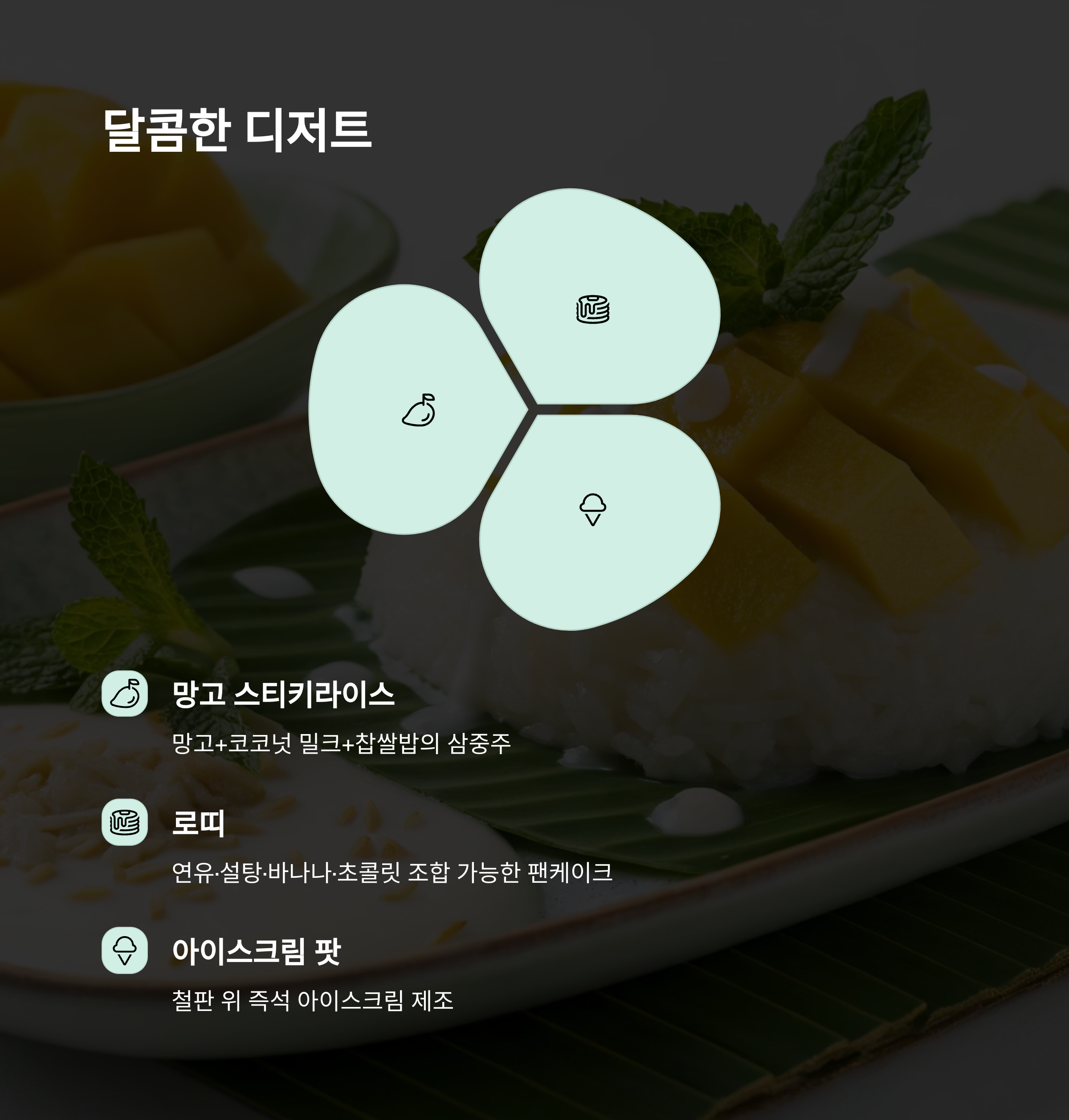 | 로띠 | 연유·설탕·바나나·초콜릿 조합 가능한 길거리 팬케이크 |