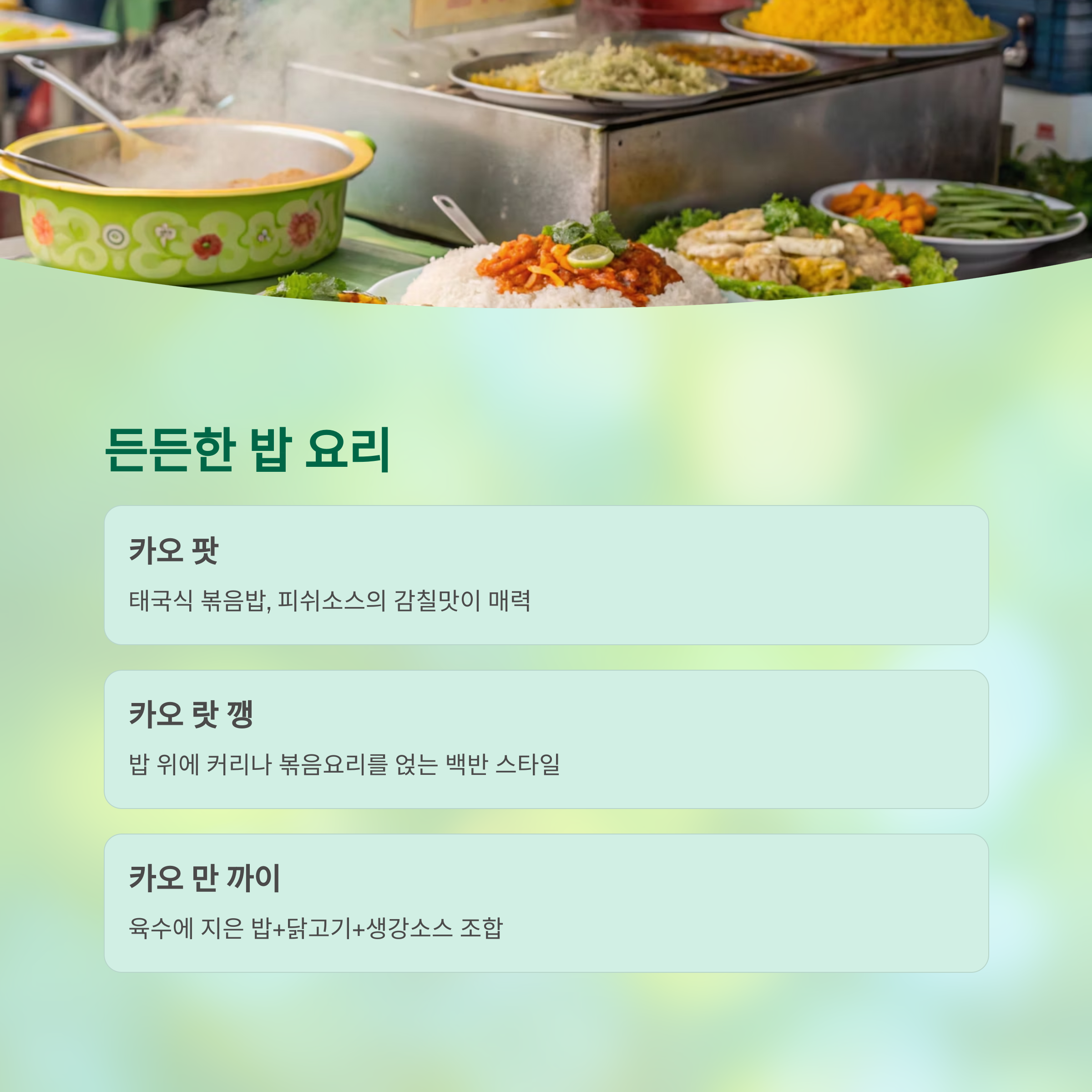 | 카오 랏 깽 | 밥 위에 커리나 볶음요리를 얹는 백반 스타일, 종류도 가격도 다양 |