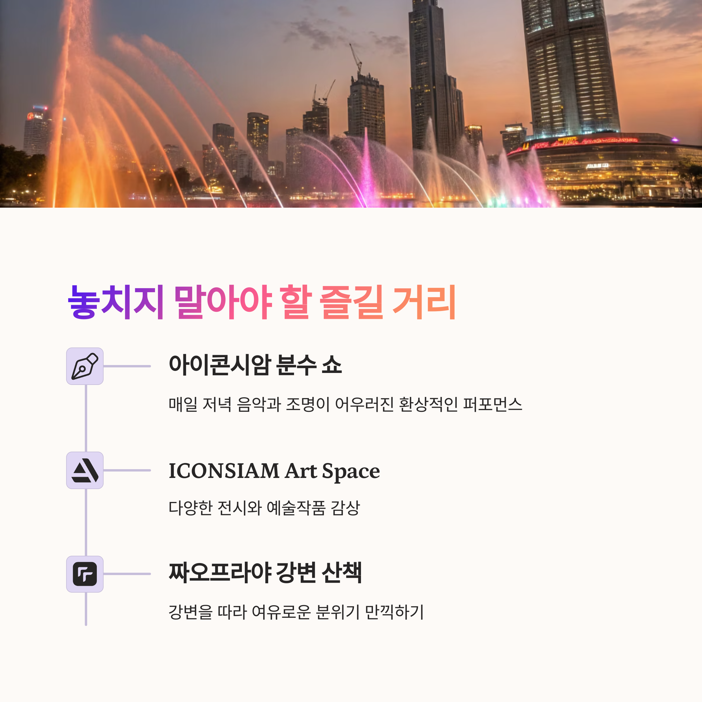 첫째, 매일 저녁 **아이콘시암 분수 쇼(ICONSIAM Fountain)**에서 음악과 조명이 어우러진