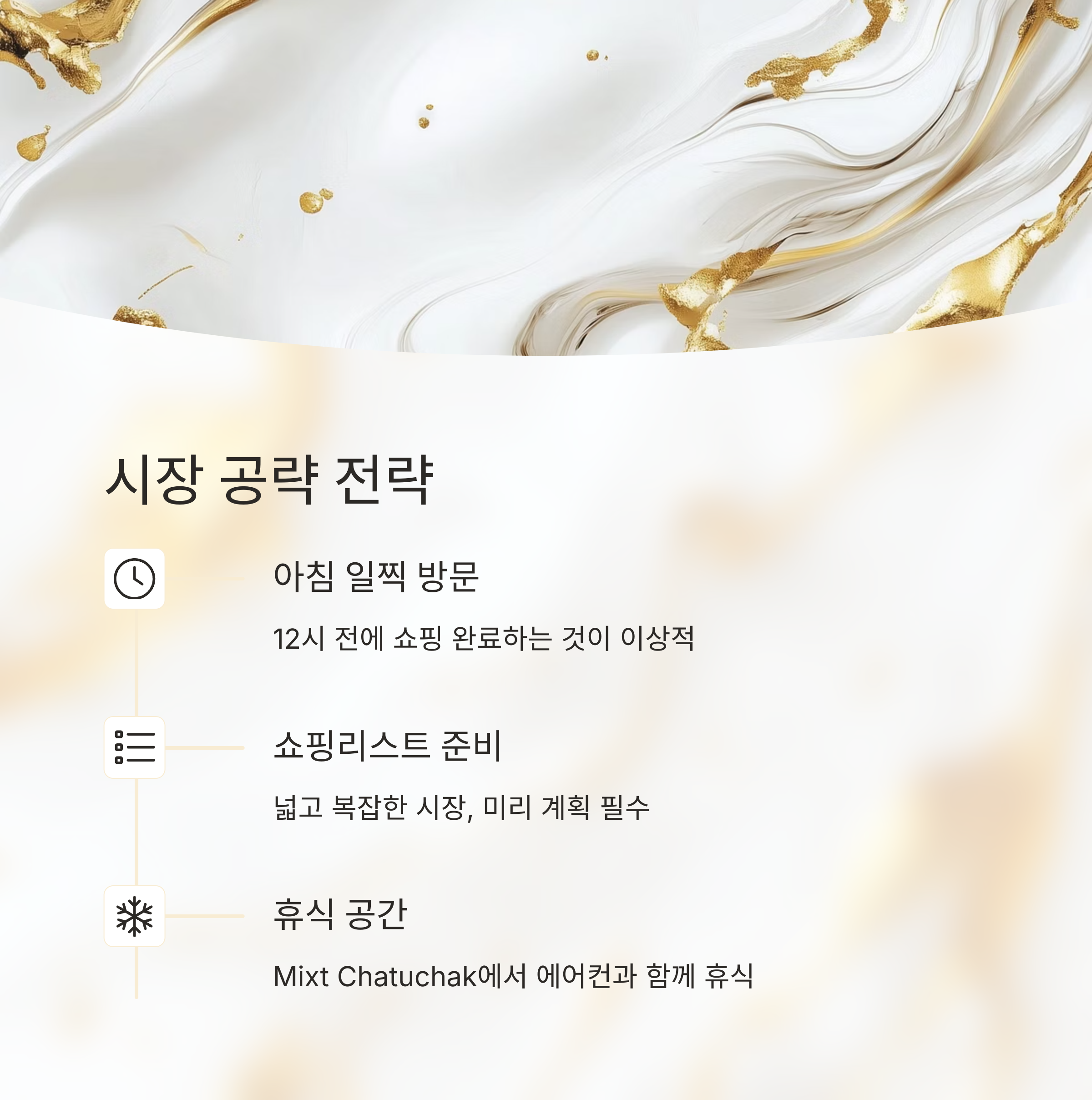 짜뚜짝 시장은 넓고 복잡하기 때문에 쇼핑리스트와 동선을 미리 계획해야 합니다.