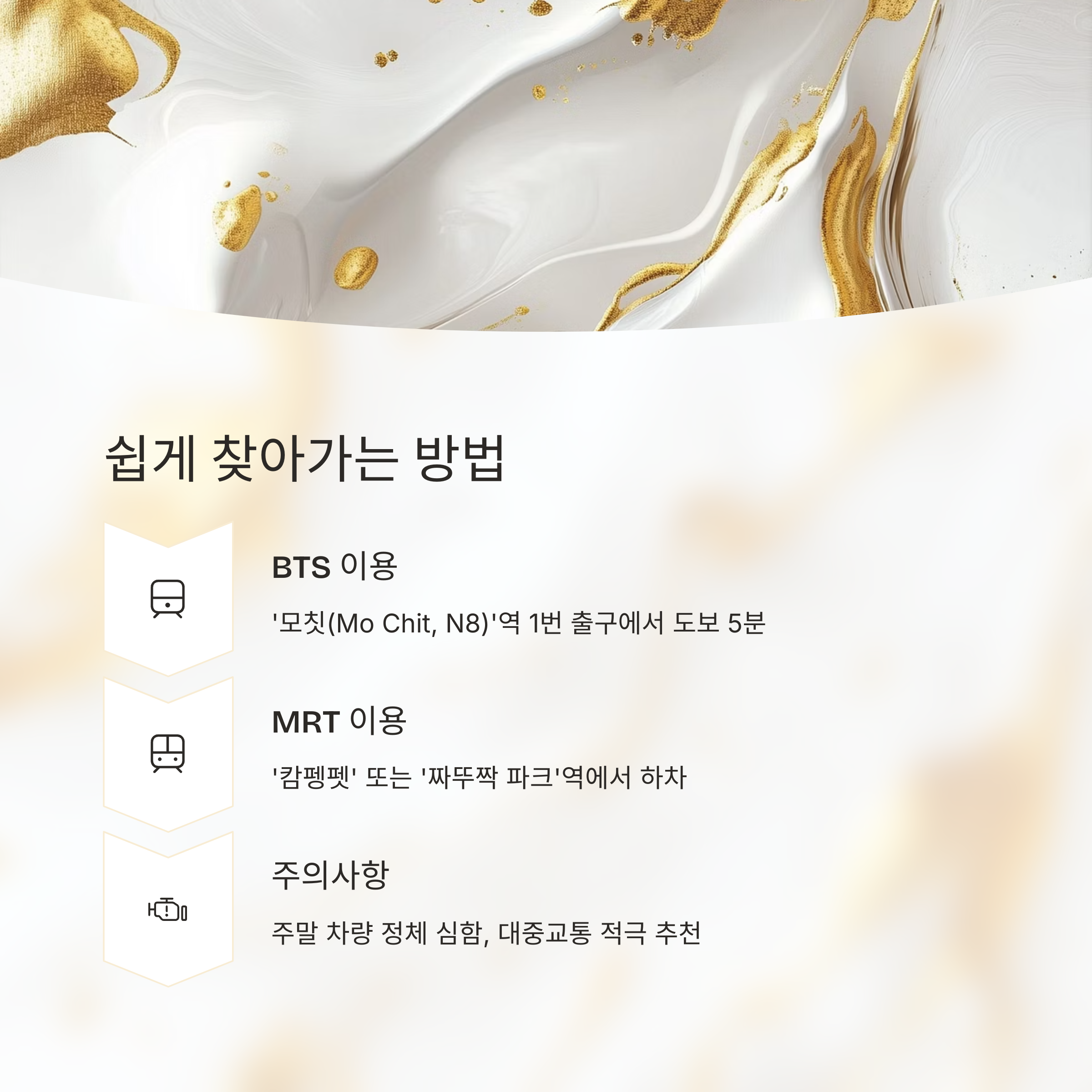 ‘짜뚜짝 파크(Chatuchak Park)’역 하차 후 도보 이동이 가장 편리합니다.