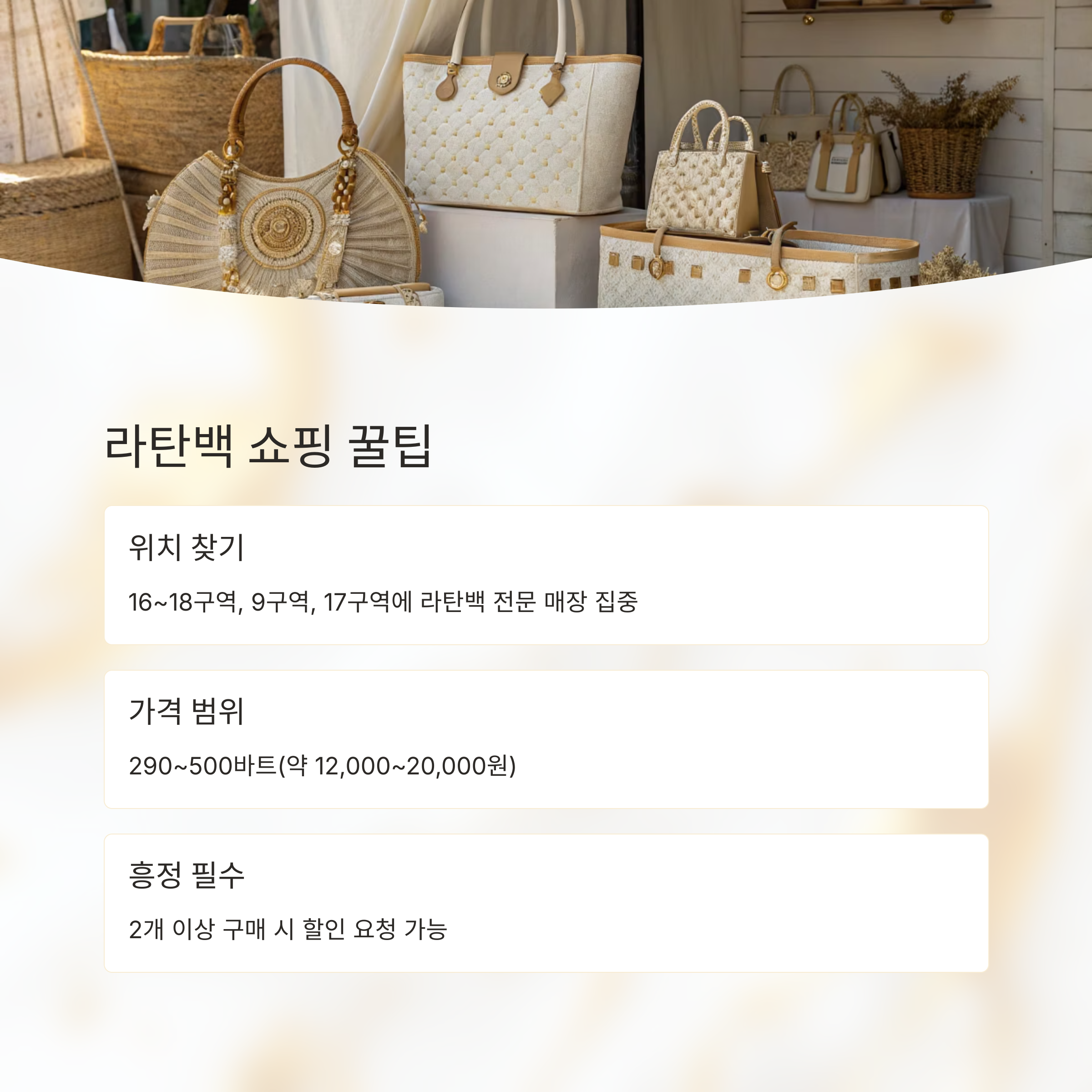 특히 여름철 필수 아이템인 라탄백을 저렴하게 구입할 수 있는 대표 쇼핑 명소로 유명합니다.