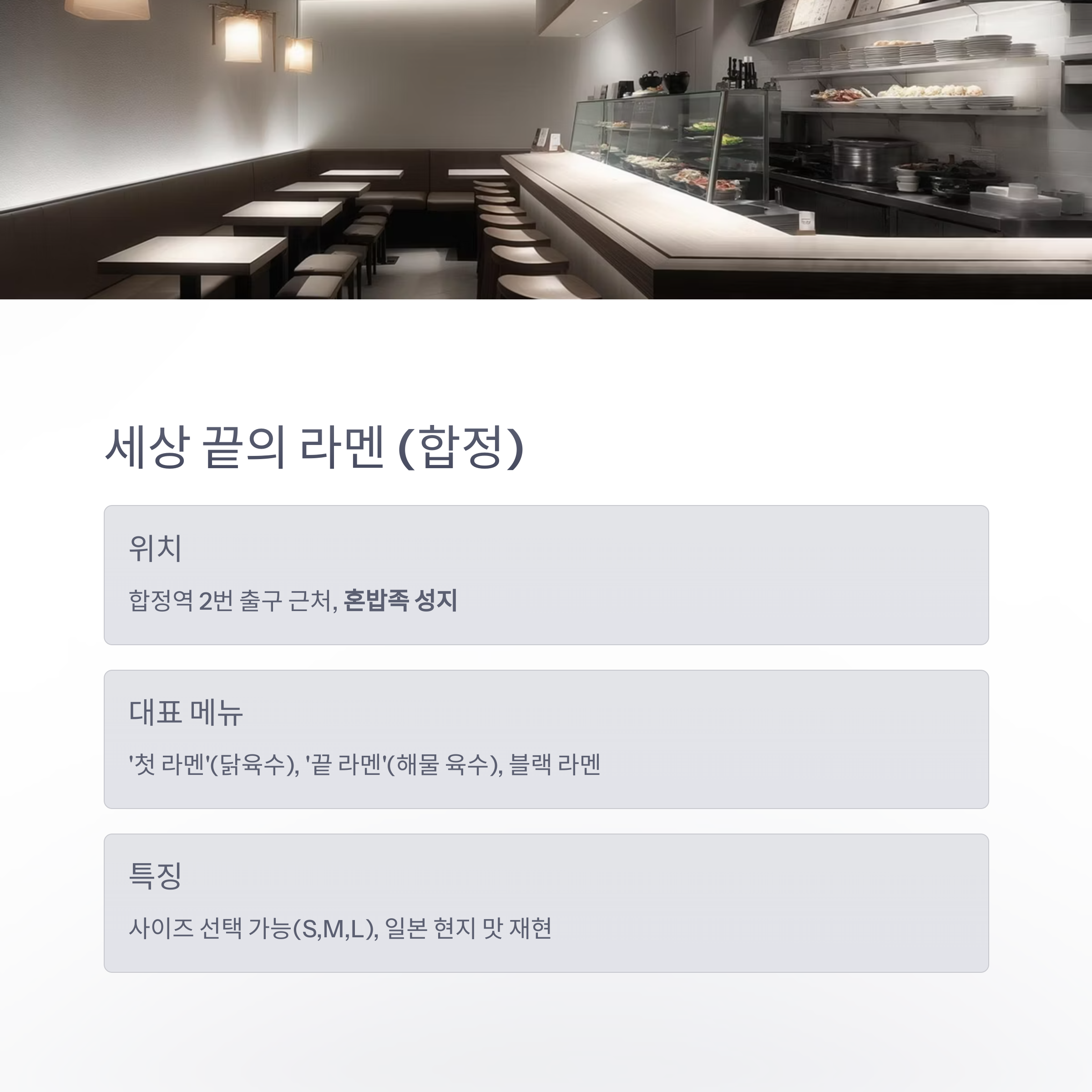 합정역 2번 출구 근처에 자리한 이곳은 혼밥족 성지로 손꼽힙니다.