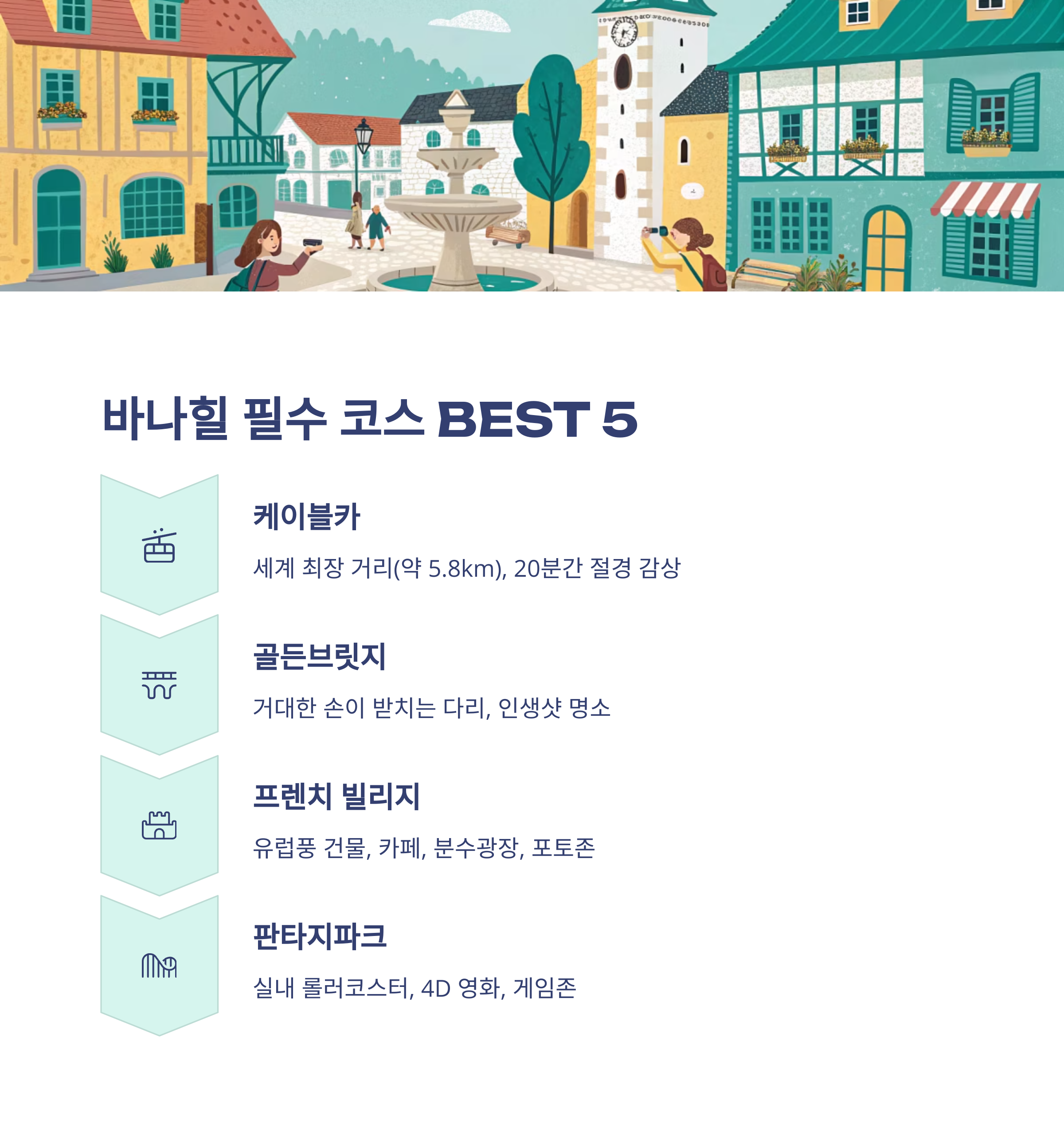 **바나힐(Ba Na Hills)**은 다낭 여행의 하이라이트로, 해발 1,487m에 위치한 유럽풍 테마파크입니다.