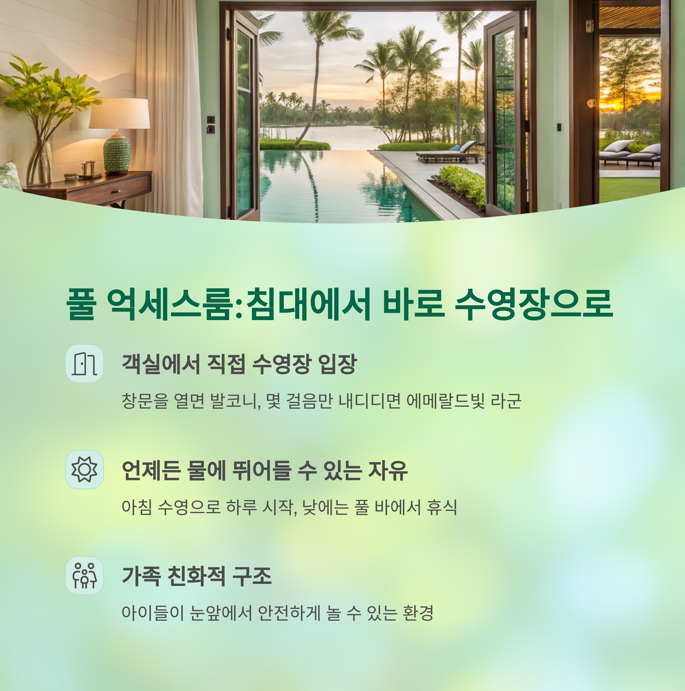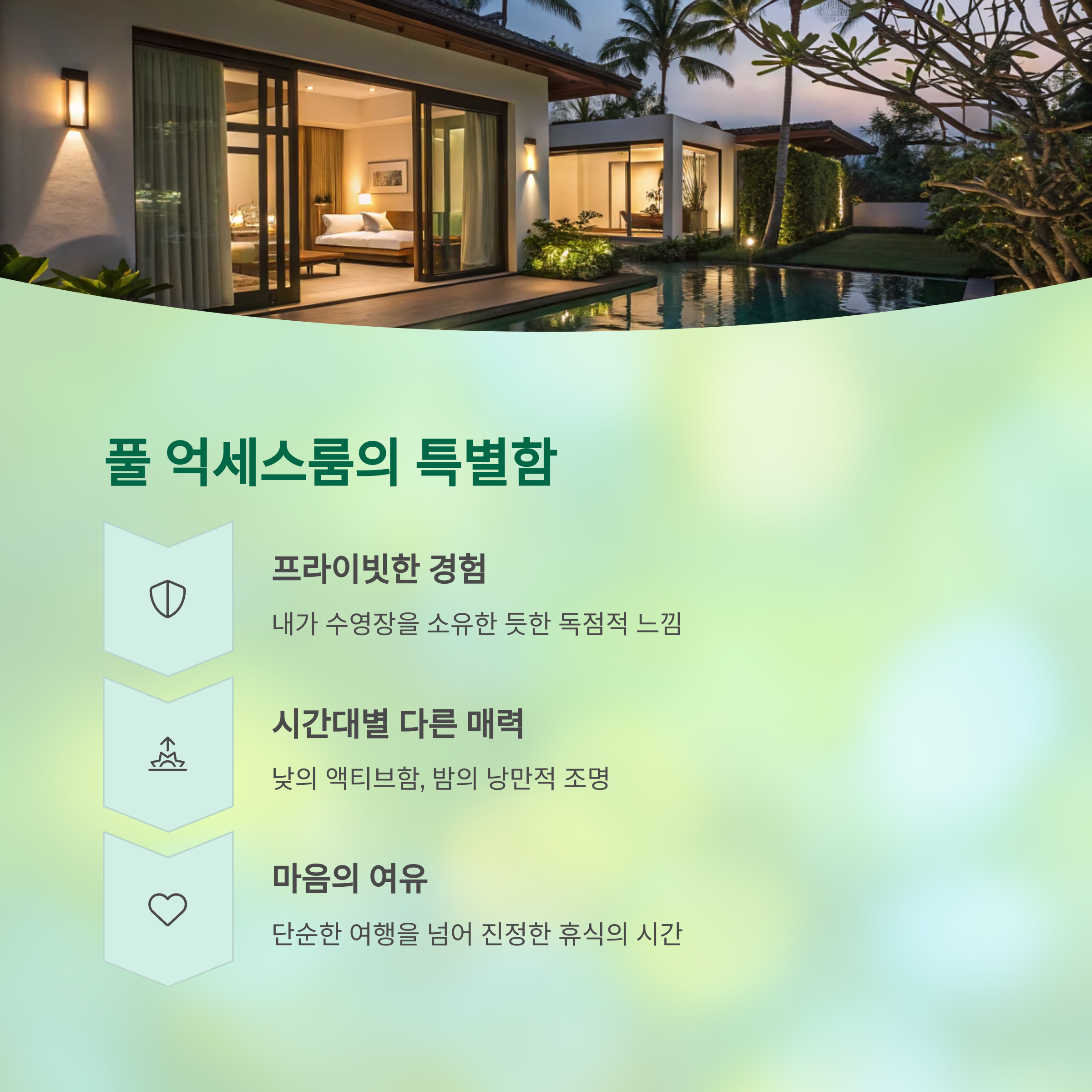 | 수영장 분위기 | 아침엔 조용한 휴식, 저녁엔 조명과 음악으로 로맨틱 |
