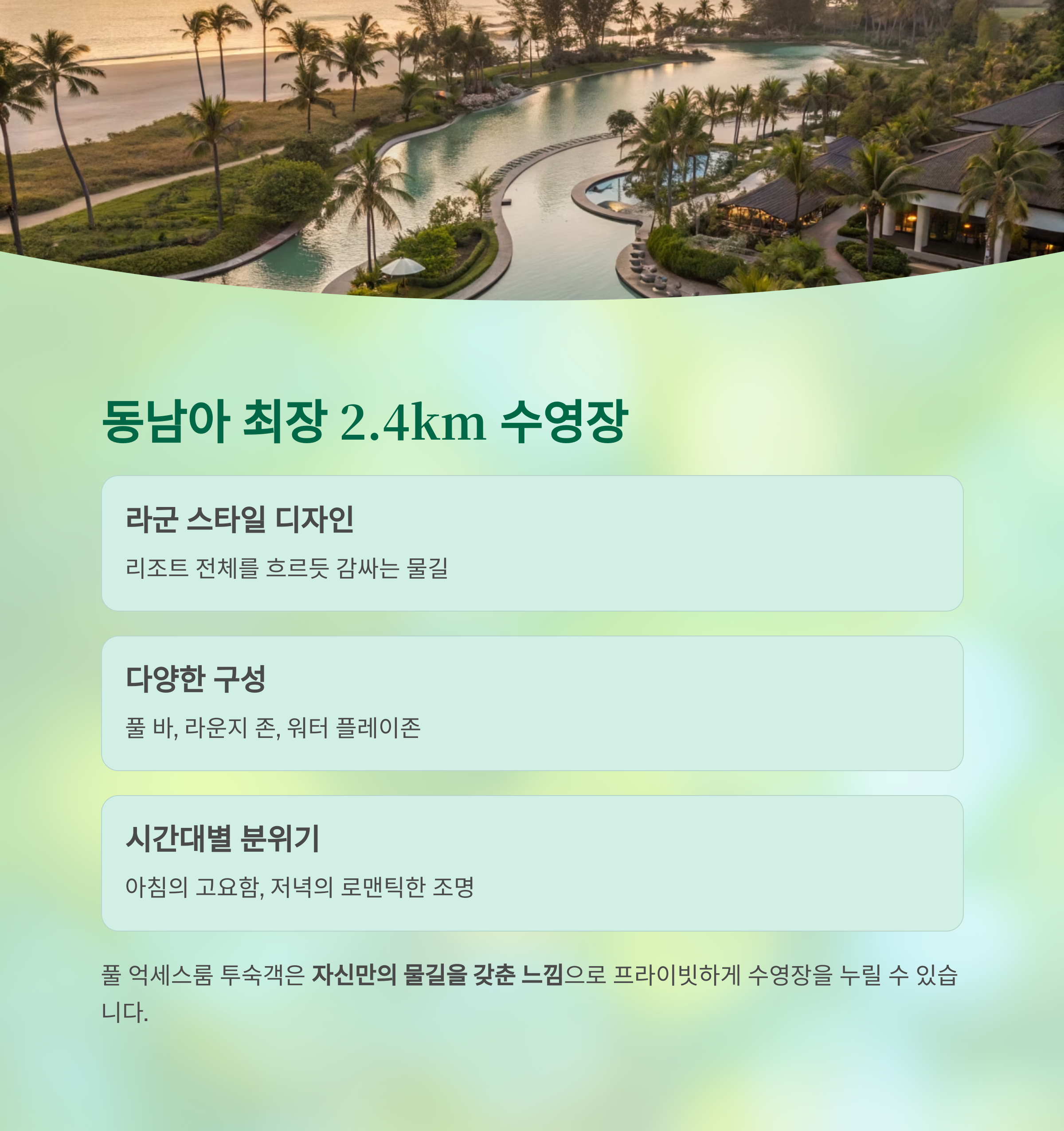 | 수영장 길이 | 2.4km 라군 스타일 |