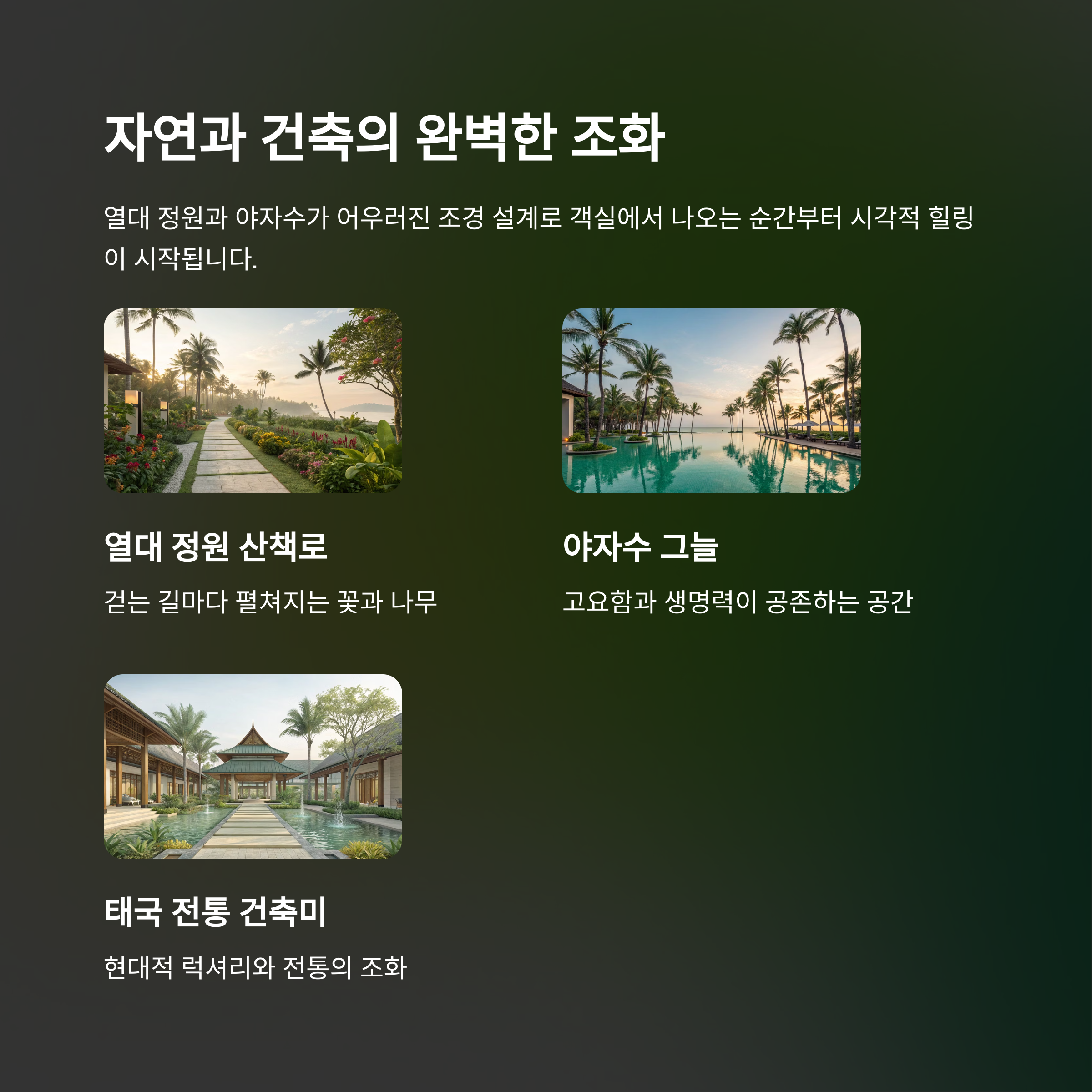리조트는 열대 정원과 야자수가 어우러진 조경 설계로
