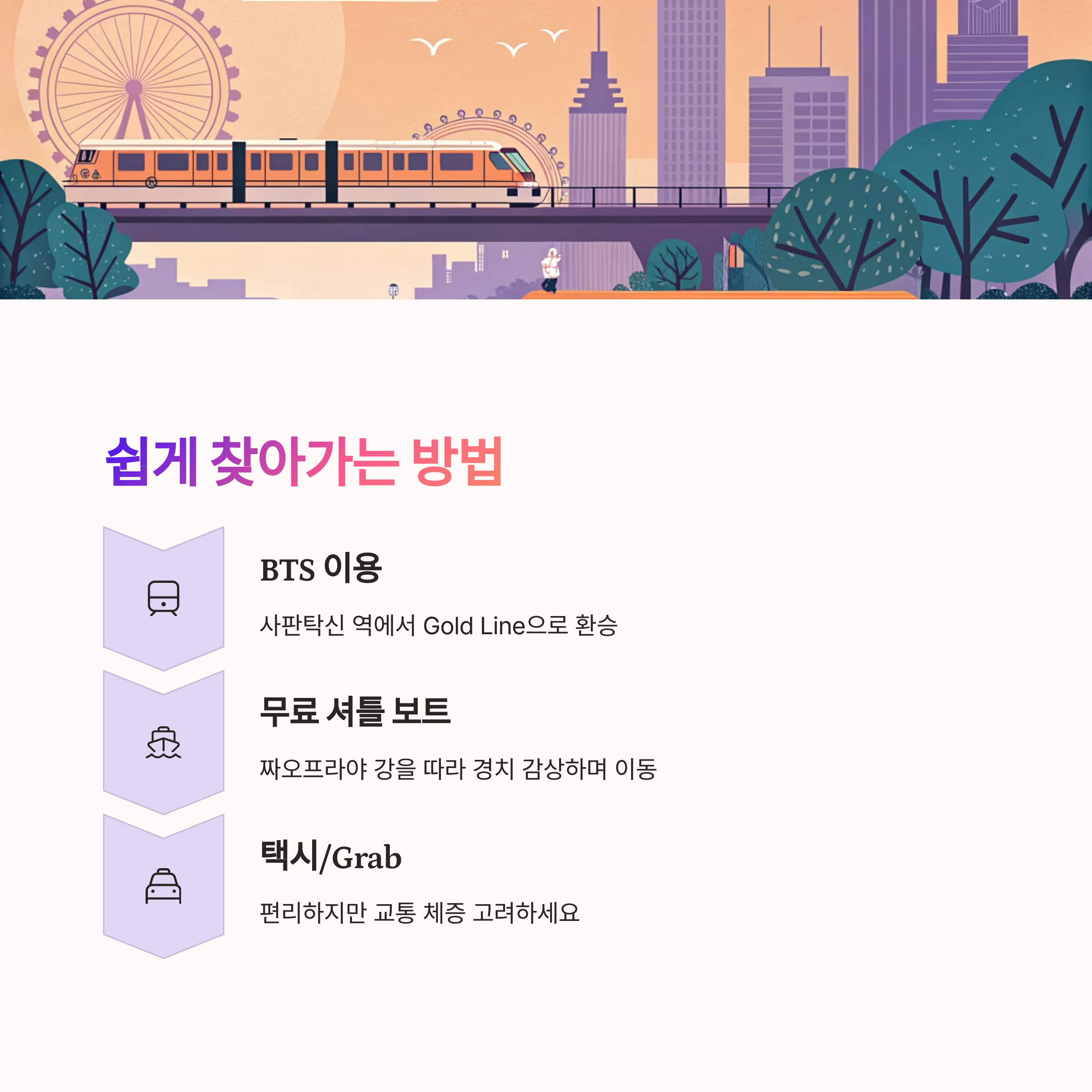 방콕 짜오프라야 강변의 웅장한 풍경과 어우러진 이곳은 다음과 같은 매력을 자랑합니다.