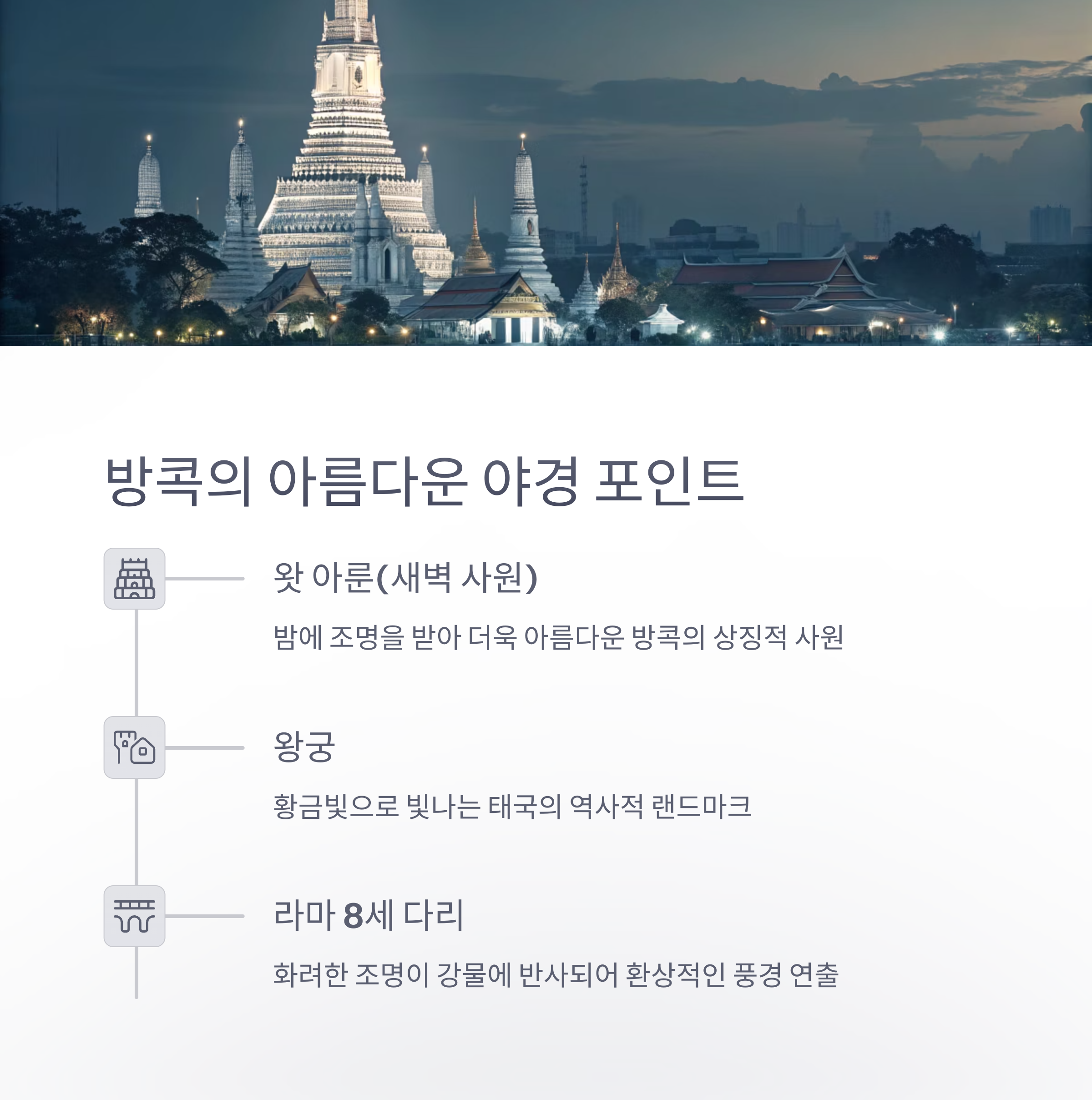 경험 중 하나입니다. 황금빛으로 빛나는 방콕의 랜드마크들과 맛있는 디너,