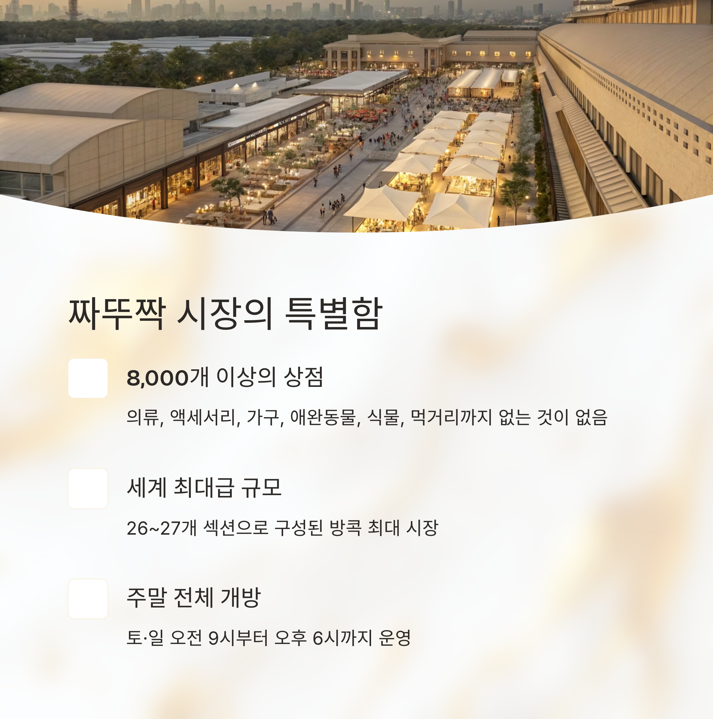 세계 최대 규모의 주말 야시장으로 불리는 이곳은 방콕 현지인과 전 세계 여행객 모두에게 사랑받는 쇼핑 천국입니다.