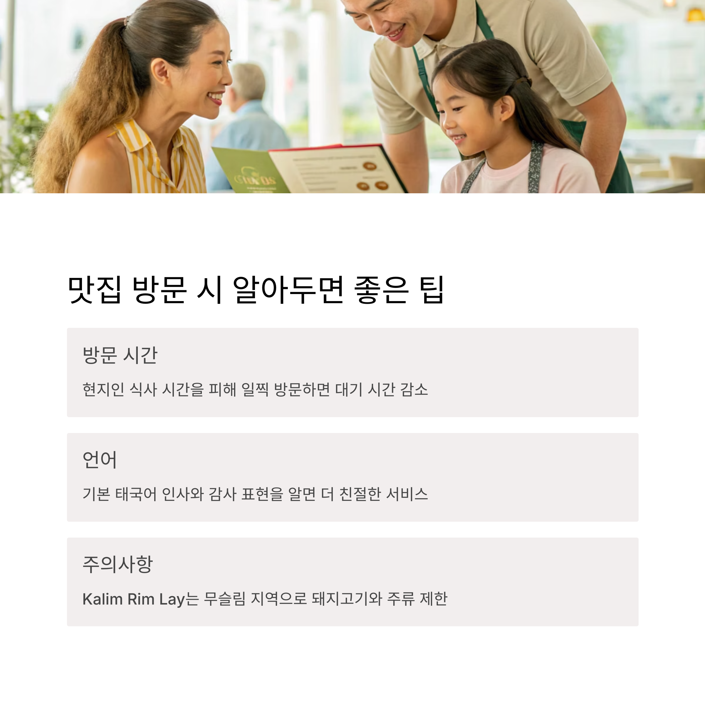 현지인이 추천하는 정통 태국 음식과 정겨운 분위기를 경험해보세요.