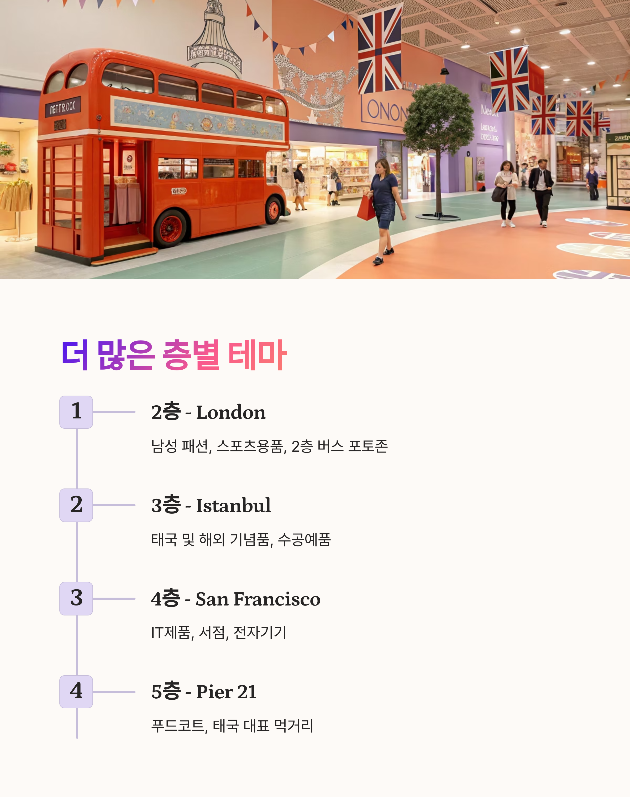 터미널21은 층별로 다른 도시와 상품군을 배치했습니다.