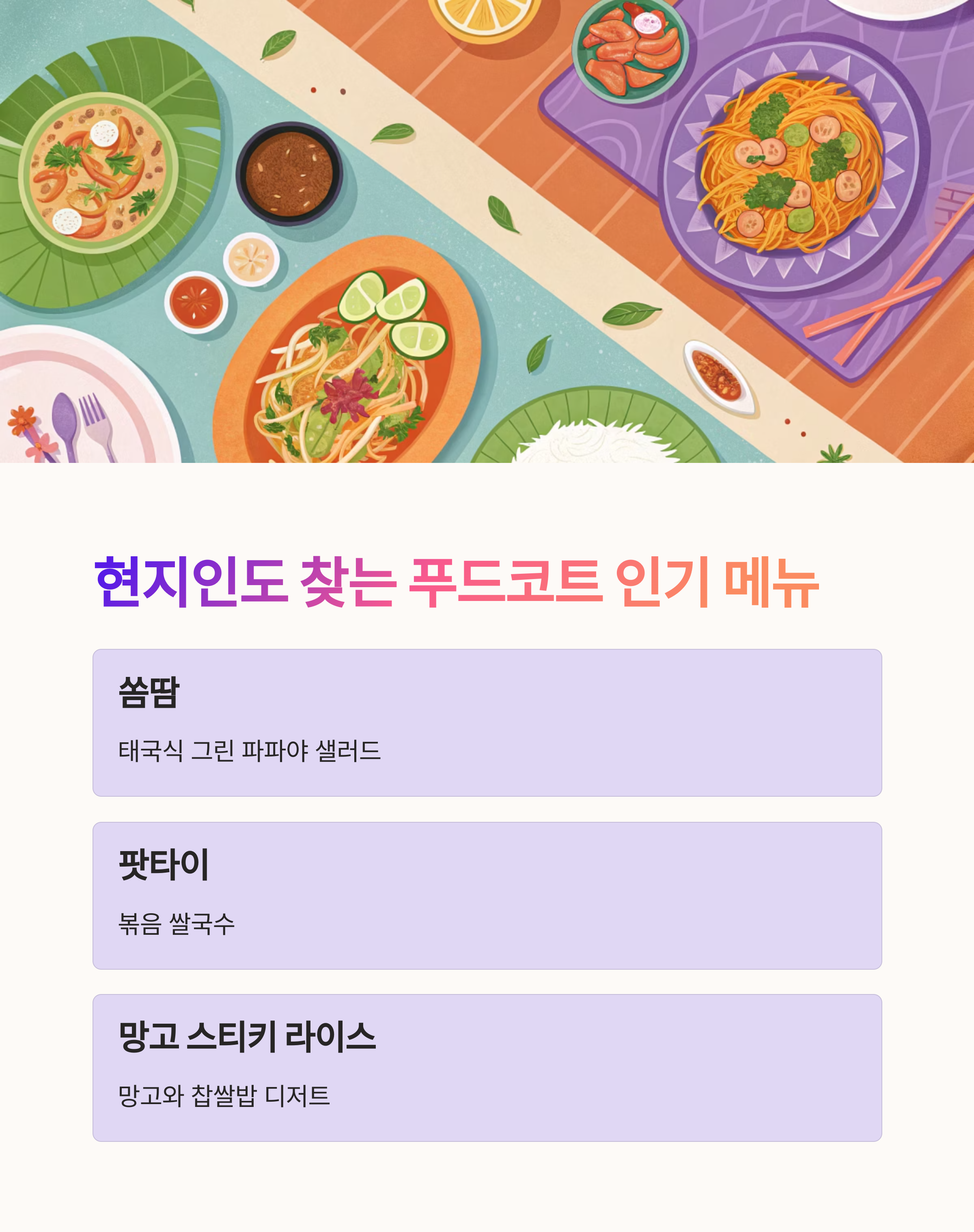 | 푸드코트 | 쏨땀, 팟타이, 카오팟, 꿰이띠아우, 망고 스티키 라이스 |